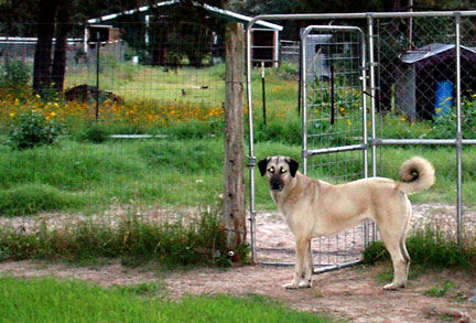 Mikarma's Nesheli (Neshe) is a female from our July 2005 litter. Kibar is her dam and Temi is her sire. Because of her correct conformation, excellent hips and wonderful temperament we kept her for our breeding program. Neshe was bred in 2009 through artificial insemination to Odaci's Python, a gorgeous male from Germany owned by Elisabeth von Buchwald. That litter, using frozen semen, produced only one pup, Mikarma's Kavron, a beautiful male living with hs new owners in British Columbia. We hope to breed her again in the future. "Nesheli" means "joyful" in Turkish, and that one word sums up Neshe's personality. She finds joy in the simplest things. She loves people, cats, and horses-- but she hates coyotes with a passion. She loves to run and play and is very athletic. She leaps to the top of the calf hutch that we use as her dog house and uses that perch to survey the surrounding pastures. She is primarily an outdoor dog, serving as a farm guardian, but she enjoys some time in the house and is very well-behaved there. She has darker coloration than many of our other pups, probably coming down from her grand-sire Kocher's Jan. |